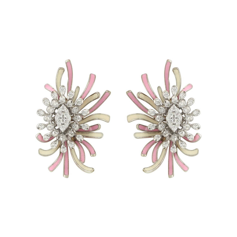 A modern floral burst design with pink enamel accents and a sparkling marquise center. Statement-worthy elegance for glamorous occasions.These exquisite statement earrings feature a radiant burst motif, adorned with brilliant-cut cubic zirconia and centered with a marquise-shaped cluster that mimics a blooming floral core. Soft pink enamel ribbons arc gracefully between polished silver-toned strokes, adding a playful contrast to the shimmering stones. Perfect for weddings, festive soirées, or glam evenings, they exude charm, luxury, and a touch of avant-garde elegance.