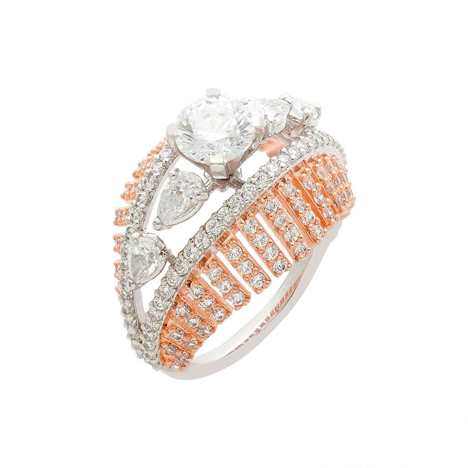 Elevate your elegance with this breathtaking rose gold and silver dual-tone statement ring. Featuring a dazzling round-cut centerpiece flanked by pear-shaped and tapered baguette stones, this design captures the essence of refined glamour. Intricately encrusted with rows of sparkling white zirconia on both rose gold and silver bands, it offers a rich, layered look without overwhelming the finger. Perfect for weddings, parties, or special occasions, this ring is a true showstopper for those who love bold, luxurious style.