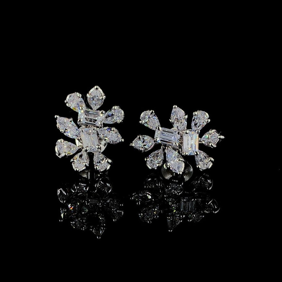 A stunning fusion of geometry and grace, the Regal Twin-Square Floral Diamond Earrings feature a bold and elegant design centered around two square-cut zirconia stones, set side by side like a regal duo. Radiating from this core are perfectly arranged pear and marquise-cut stones, forming a floral burst that shimmers with every turn. Crafted in a refined silver-toned finish, these earrings embody luxury and precision, making them ideal for festive occasions, bridal events, or statement wear.