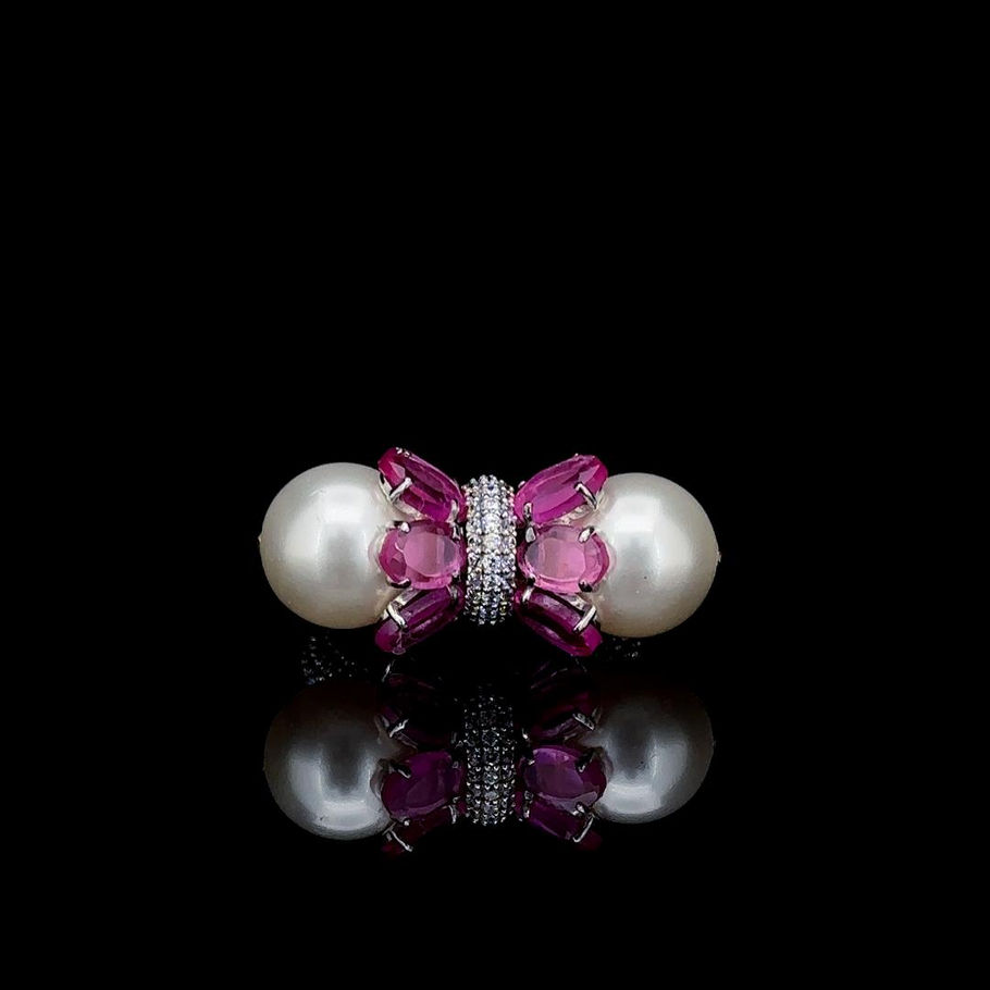 The Duchess Duo is a true showstopper—regal, radiant, and irresistibly bold. Designed with a high-shine rhodium-plated band paved with brilliant cubic zirconia, this piece features two statement pearls seated opposite each other, framed with a flourish of vibrant pink gemstones in varying cuts. The design is both modern and majestic, making it perfect for grand occasions or fashion-forward statements.
